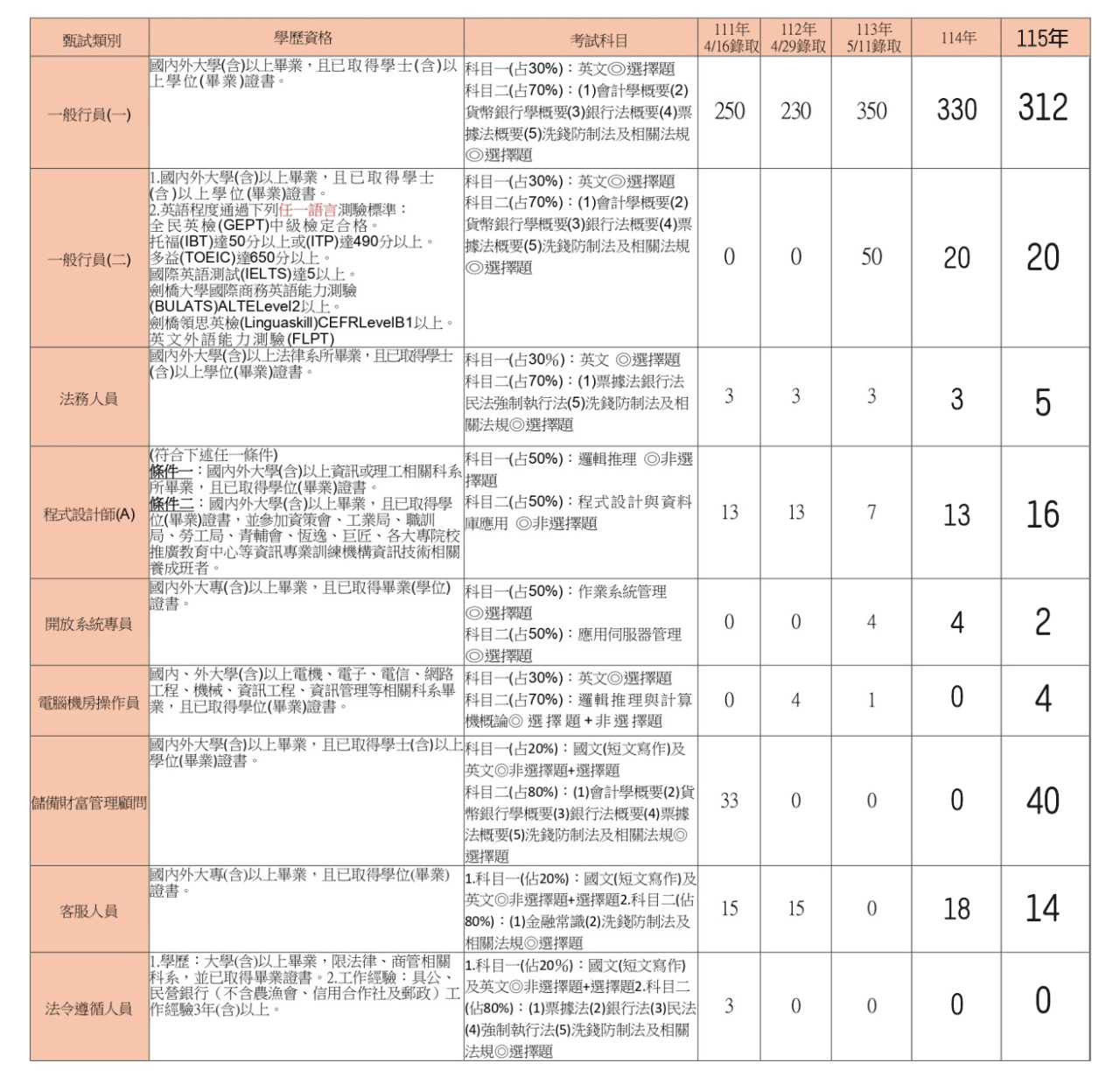 ★【主題(之二)】:【彰化銀行招考】→【錄取名額‧考試科目】: