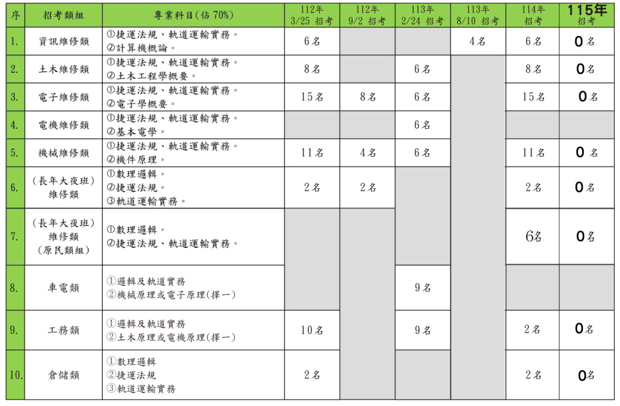 (二)【新北捷運】招考:【行車組】~【技術員】~【(資訊、電子、電機、機械、大夜班、原住民)維修人員】