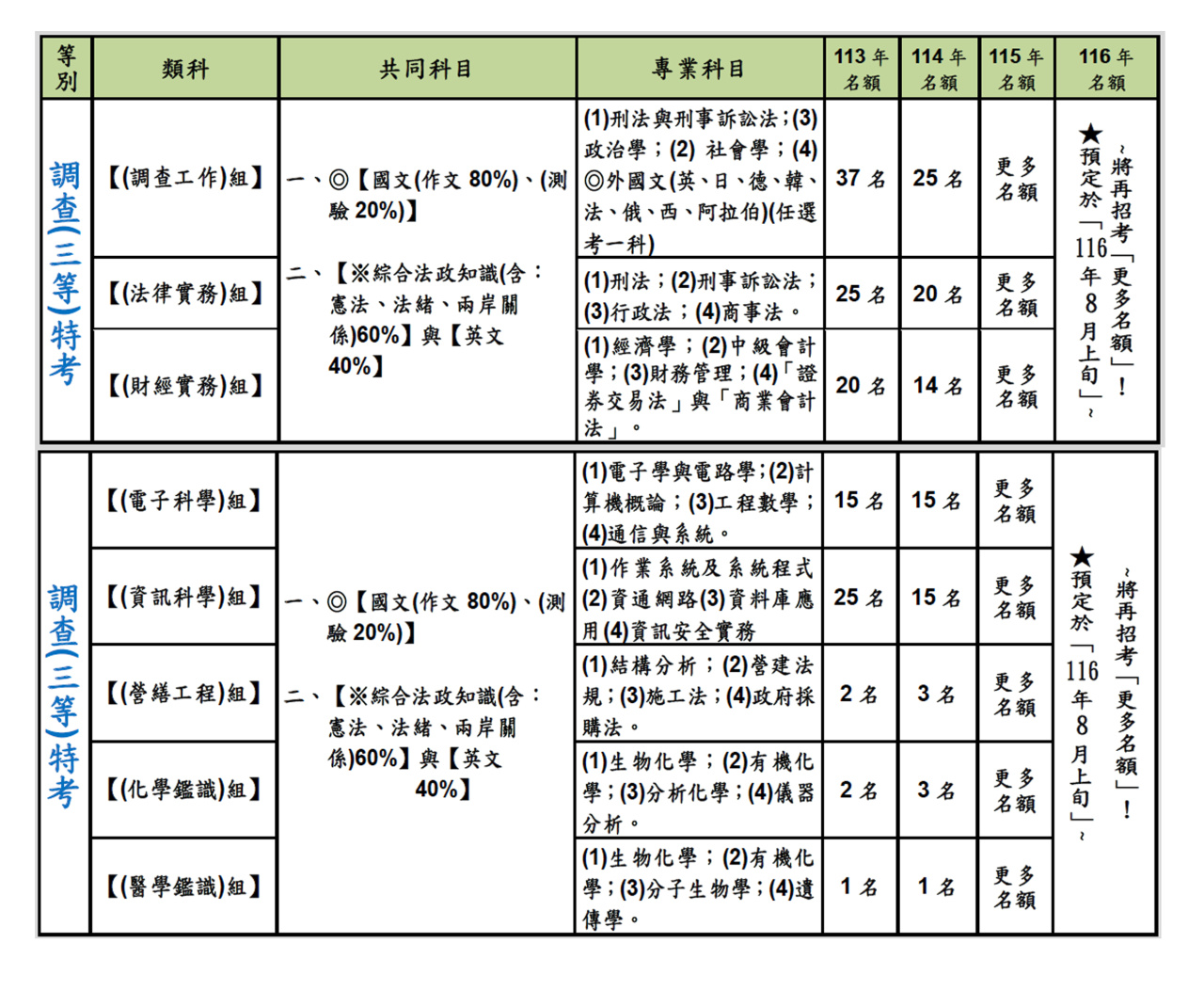 (6)【115 年 8 月 8 日】→「調查(三等)特考」→將再招考「更多名額」!