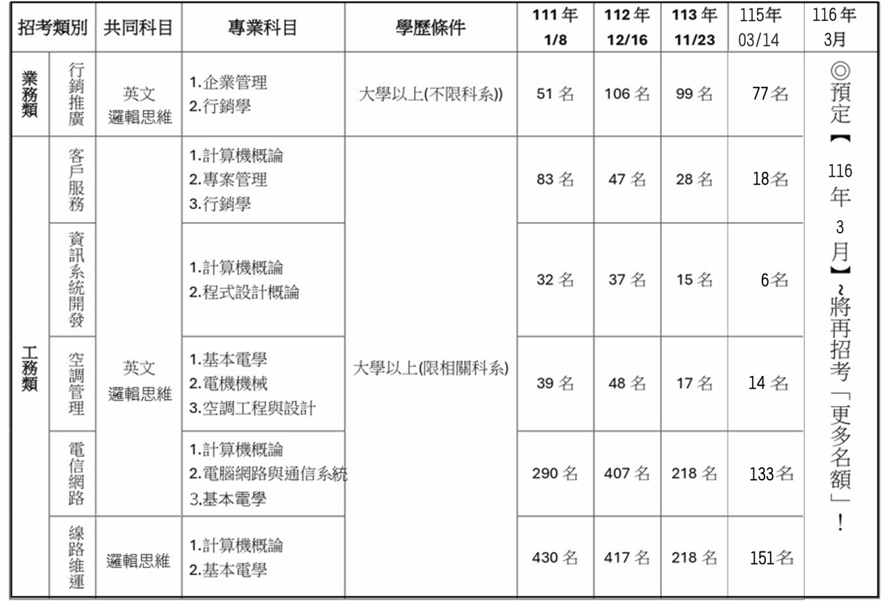 [5].【115 年 3 月 14 日】→「(中華電信)招考(從業專員)」→將再招考「正取共 399 名、備取 287 名」!