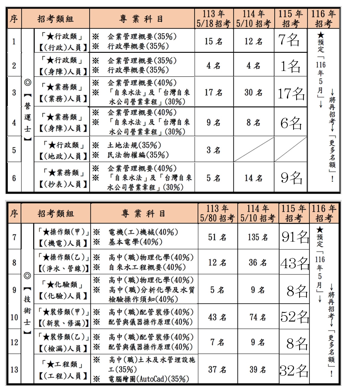 (5).【115 年 5 月 23 日】→【(台水)招考(評價人員)】→將再招考「296 名以上」!