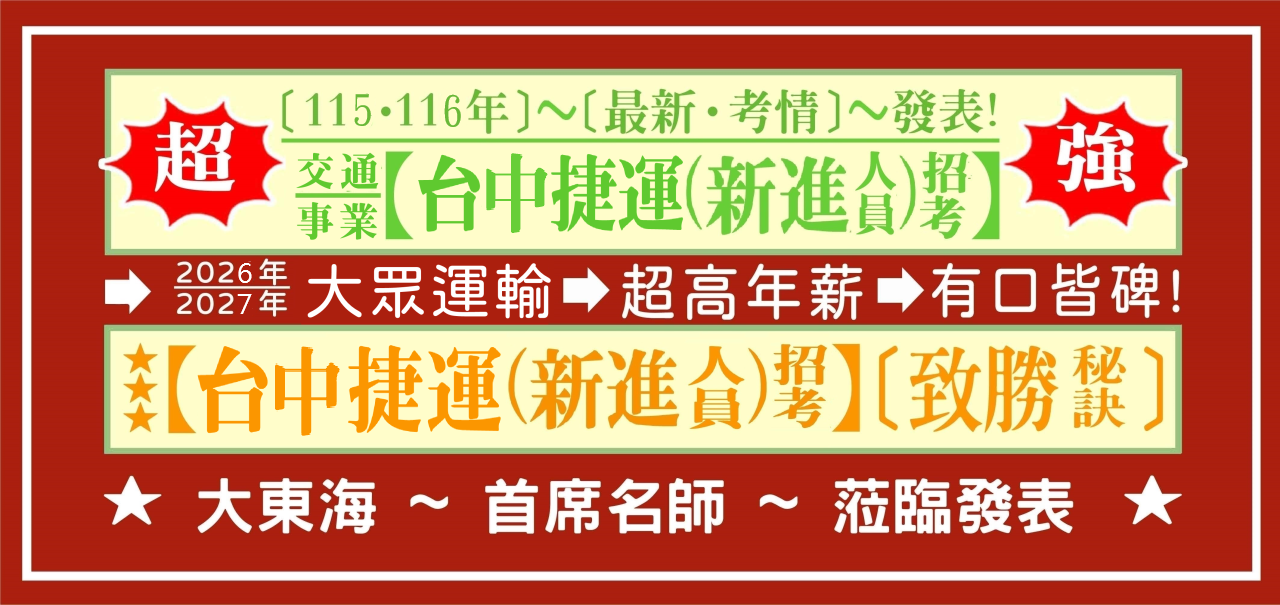 (二)【台中捷運(一般組)】:【工程員(二)】~【運輸行銷;經營企劃】→「研究所畢(相關院所)」暨「以上學歷」→不限年齡,男女皆可報考!