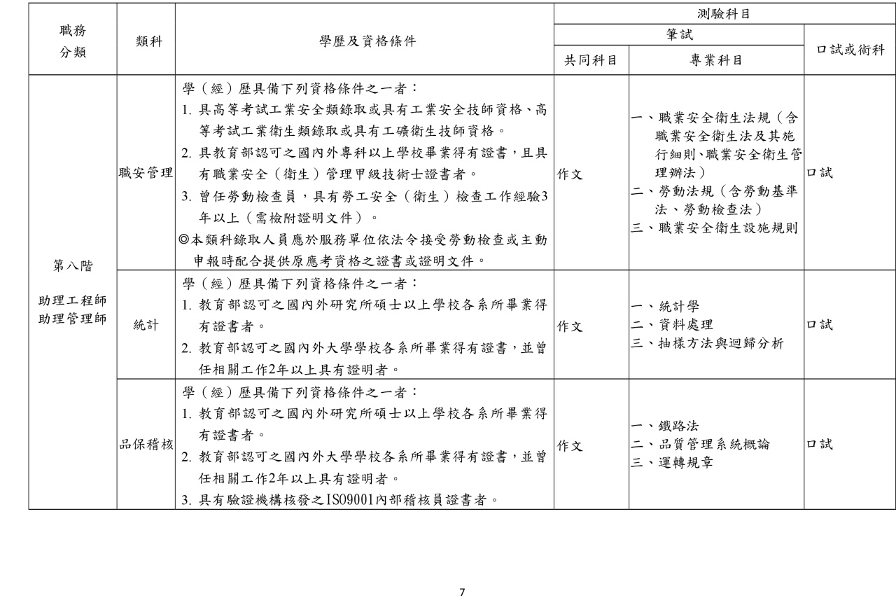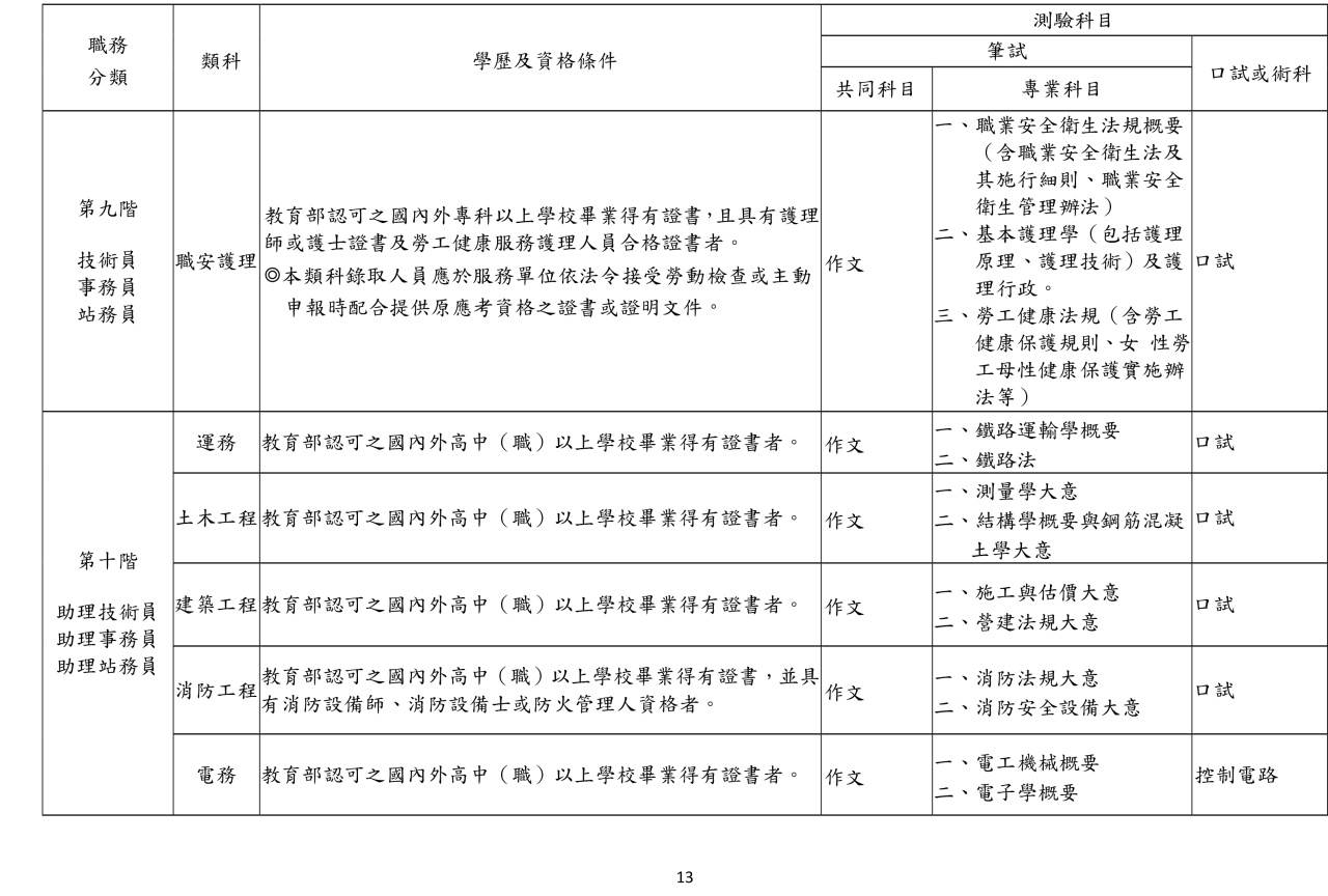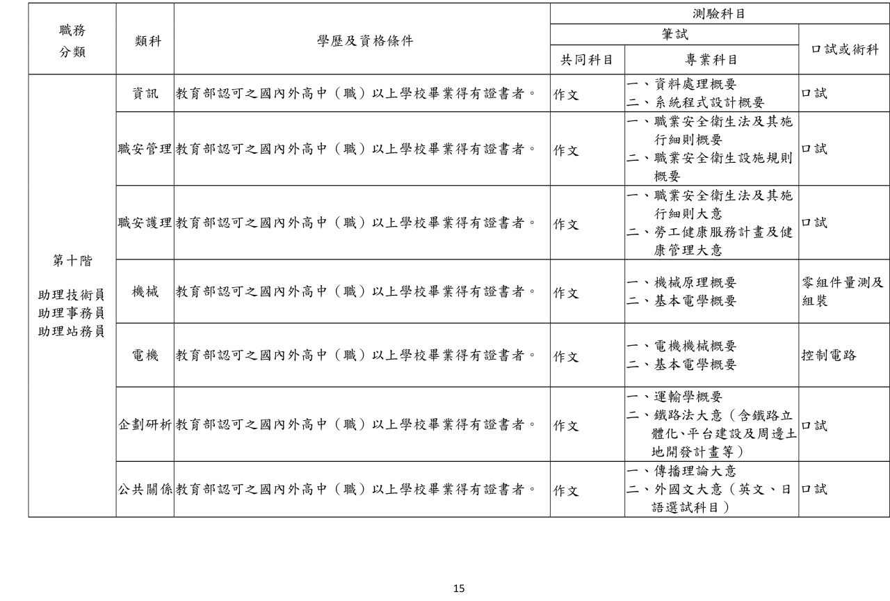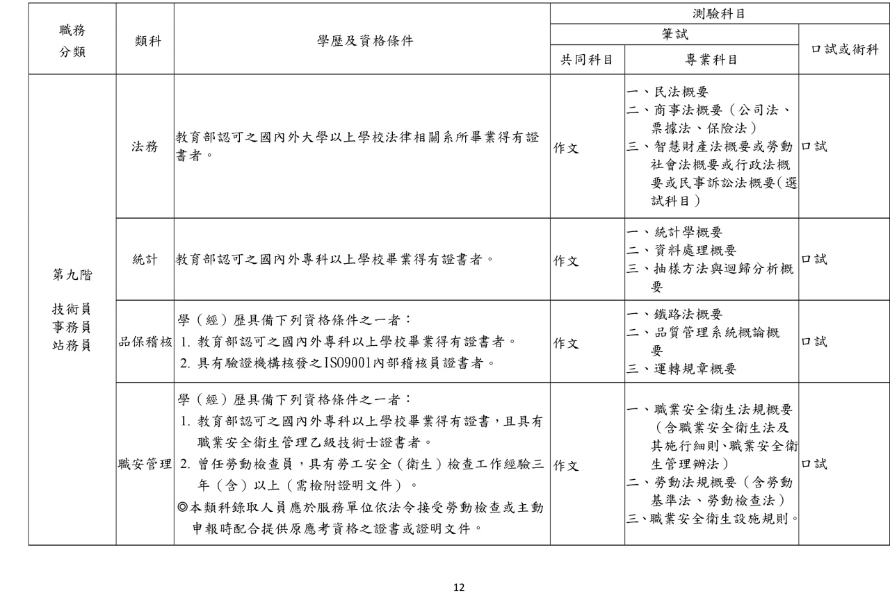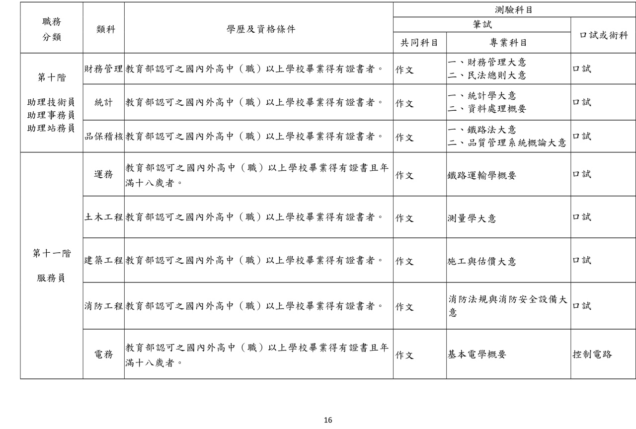 →分為【(1)運輸營業;(2)事務管理;(3)材料管理;(4)會計人員;(5)法律廉政;(6)地政人員;(7)資訊處理;(8)電子工程;(9)電力工程;(10)機械工程;(11)土木工程……等】→ 各類‧鐵路服務人員!