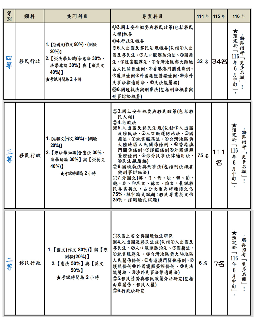 (6)[115 年 6 月 13 日]→「移民(二等‧三等‧四等)特考」→將再招考「164 名」!(二等 7 名.三等 123 名.四等 34 名)