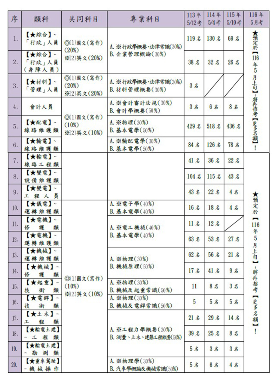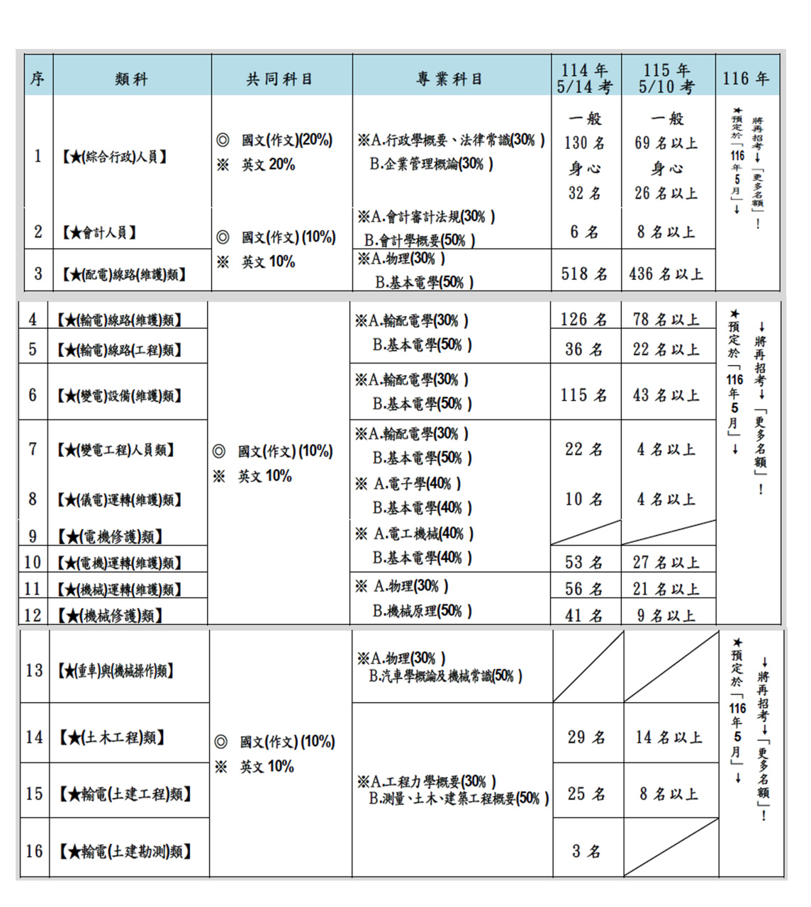★【註】:「115 年 5 月 10 日」招考→還有, 其他各類組「考試科目」及「工作性質」, 詳見「台電招考簡章」 !