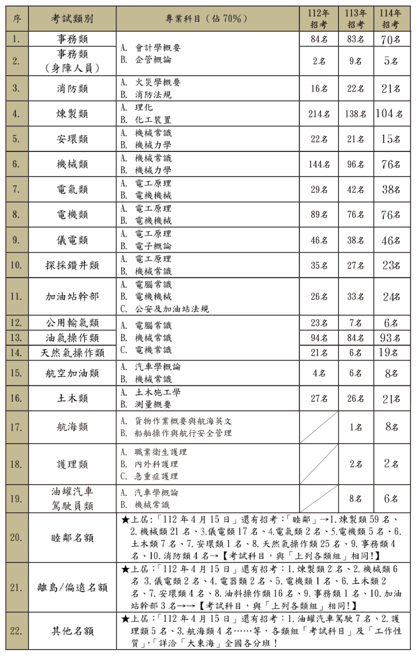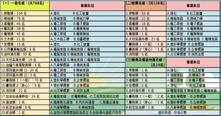(一)【中油(新進工員)】→「招考類別、「考試科目、錄取名額」: