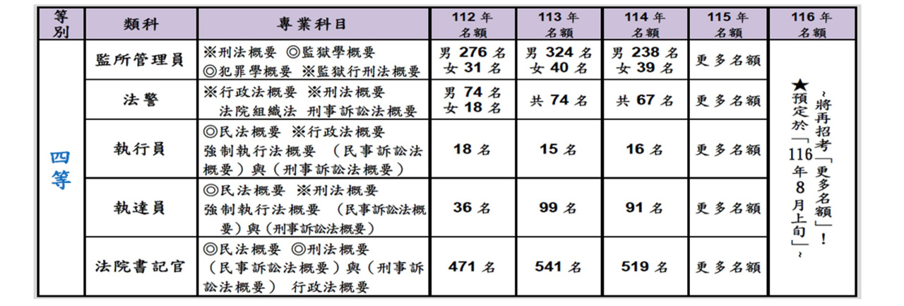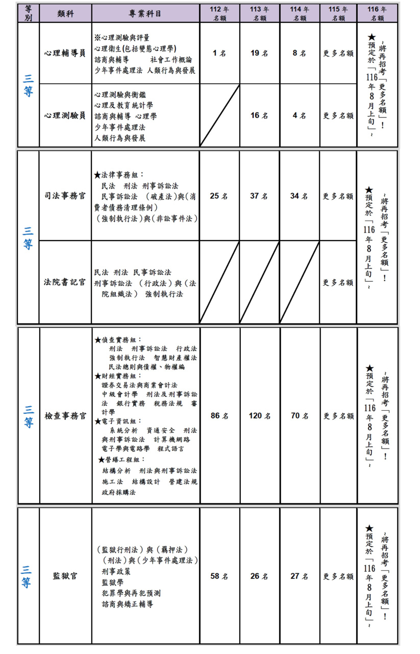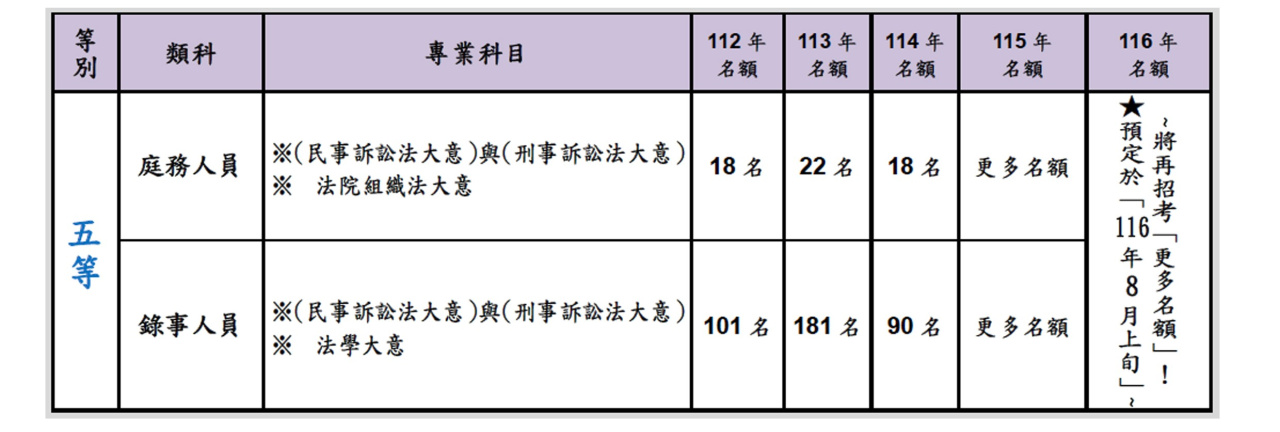 (五)[115 年 8 月 8 日]「司法(三等‧四等‧五等)」→將再招考「更多名額」!