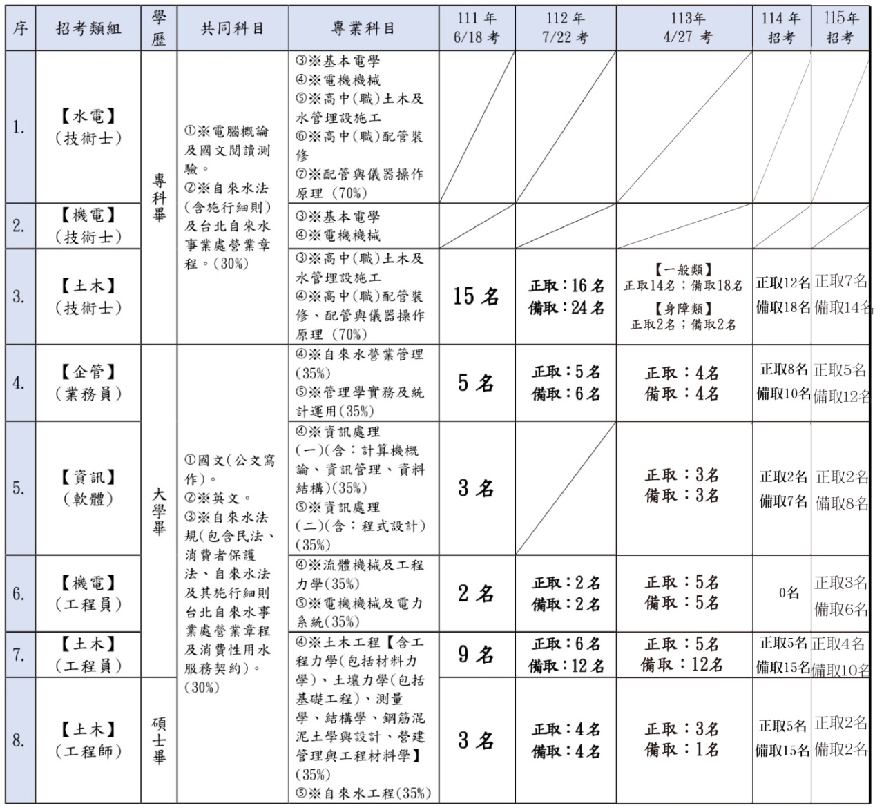 ◎【114 、 115 年】→ 【(北水)招考】→【新進工員】之【招考類別、考試科目、計分比率】與【錄取名額】: