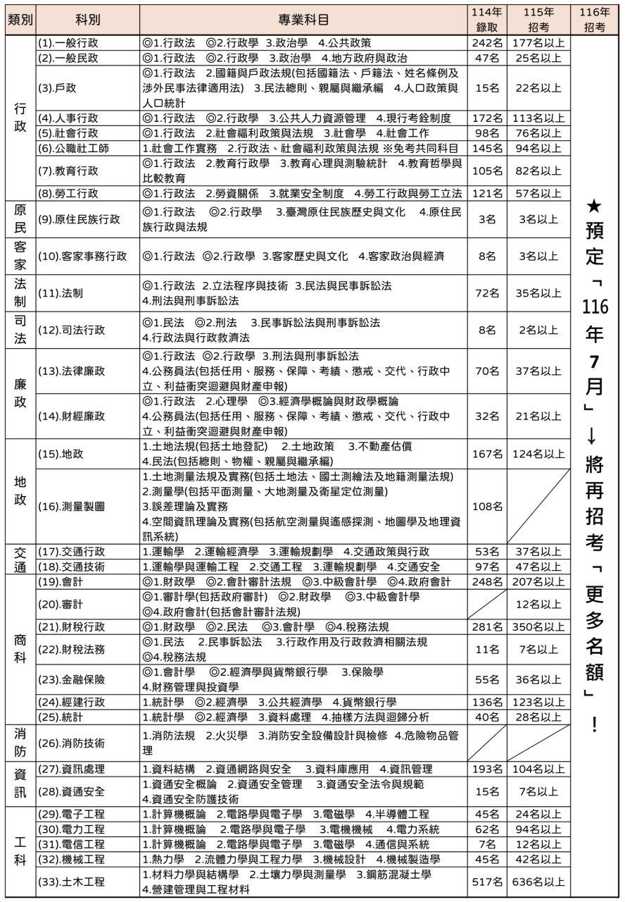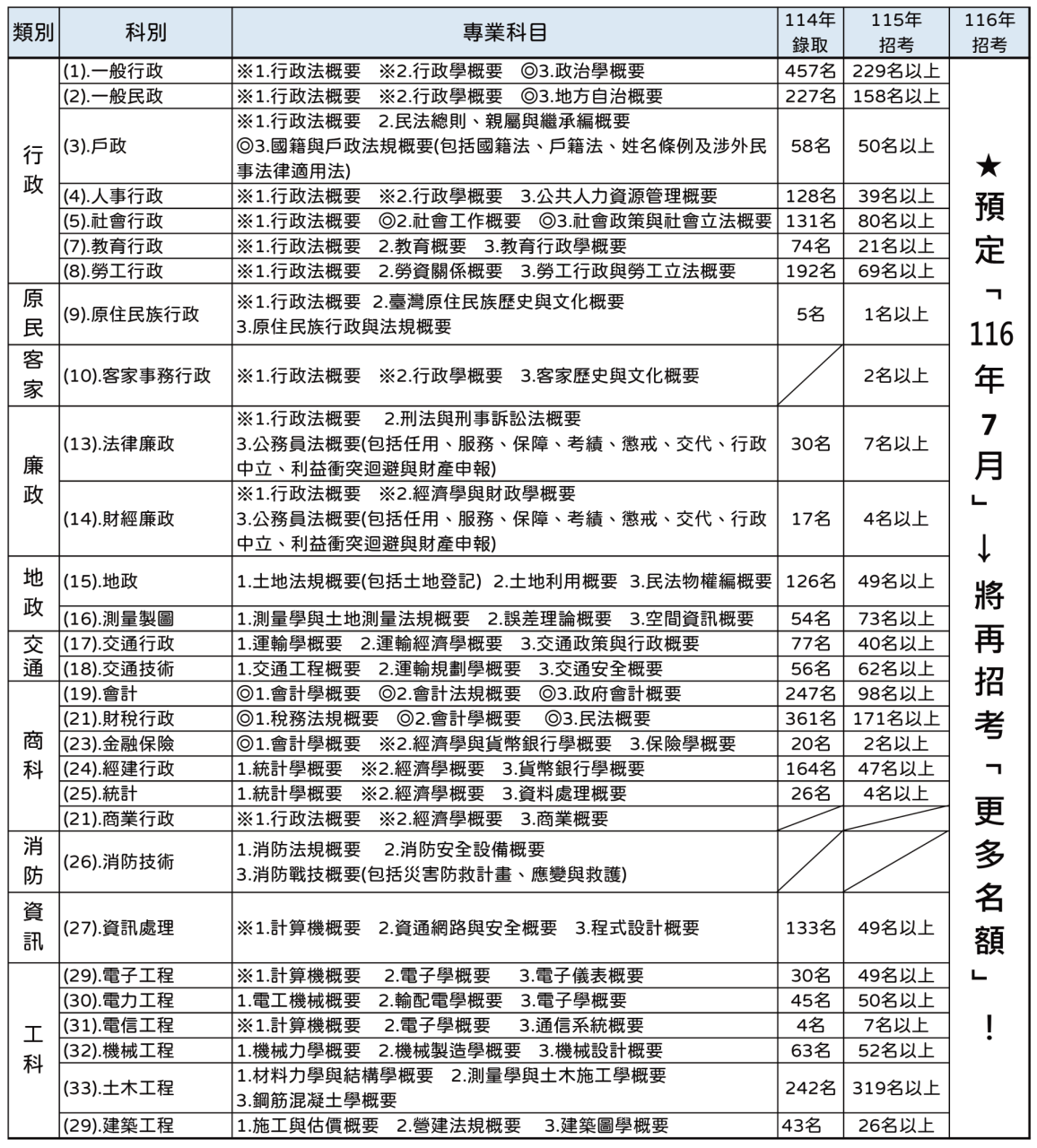 (1).「高考・專業科目」,原考 6 科→減少為考 4 科」; (2).「普考・專業科目」,原考 4 科→減少為考 3 科」→自「113 年考試」開始實施・適用!
