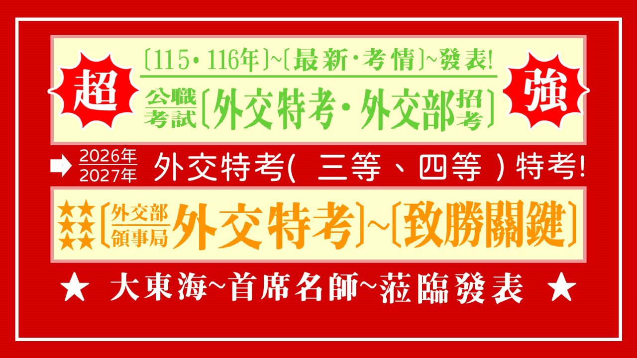 (1)【外交(三等)領事人員】:[共同科目(考 2 科)]+[專業科目(考 4 科)]→共考[6 科]!