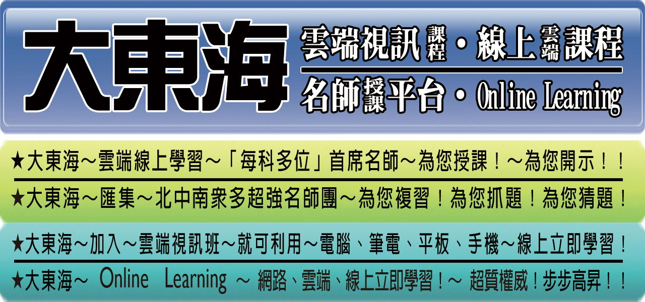 - 如果,您在「現場面授課」上課時,容易恍忽閃神,或抄寫板書速度不夠快,而容易錯失了課堂中的命題重點!極希望「只繳費一次」,就可不限次數的重複聽看課程,或多次再複習!則「大東海~雲端視訊教學課程」,就是您的最愛!